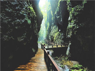 朝陽地縫(朝陽大峽谷)位于趙家埡水庫底部,是一個外河流入型的水底大溶洞,洞高30—80m,寬道5—25m,全長1550m,洞穴廊道呈峽谷狀態(tài),走向由南向北穿山而過,落差80余米,形成于高山峰叢喀斯特峽谷流域,深切河床滲漏石灰?guī)r斷層層里裂隙,向含水層集中循環(huán),再經(jīng)溶蝕、侵蝕崩塌作用,形成與原河道平行的地下通道,是喀斯特區(qū)過境河的伏流河。